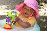 She is now also able to sit when placed in a sitting position for a little bit before toppling over. Plus, she has a great new high-pitched happy scream!